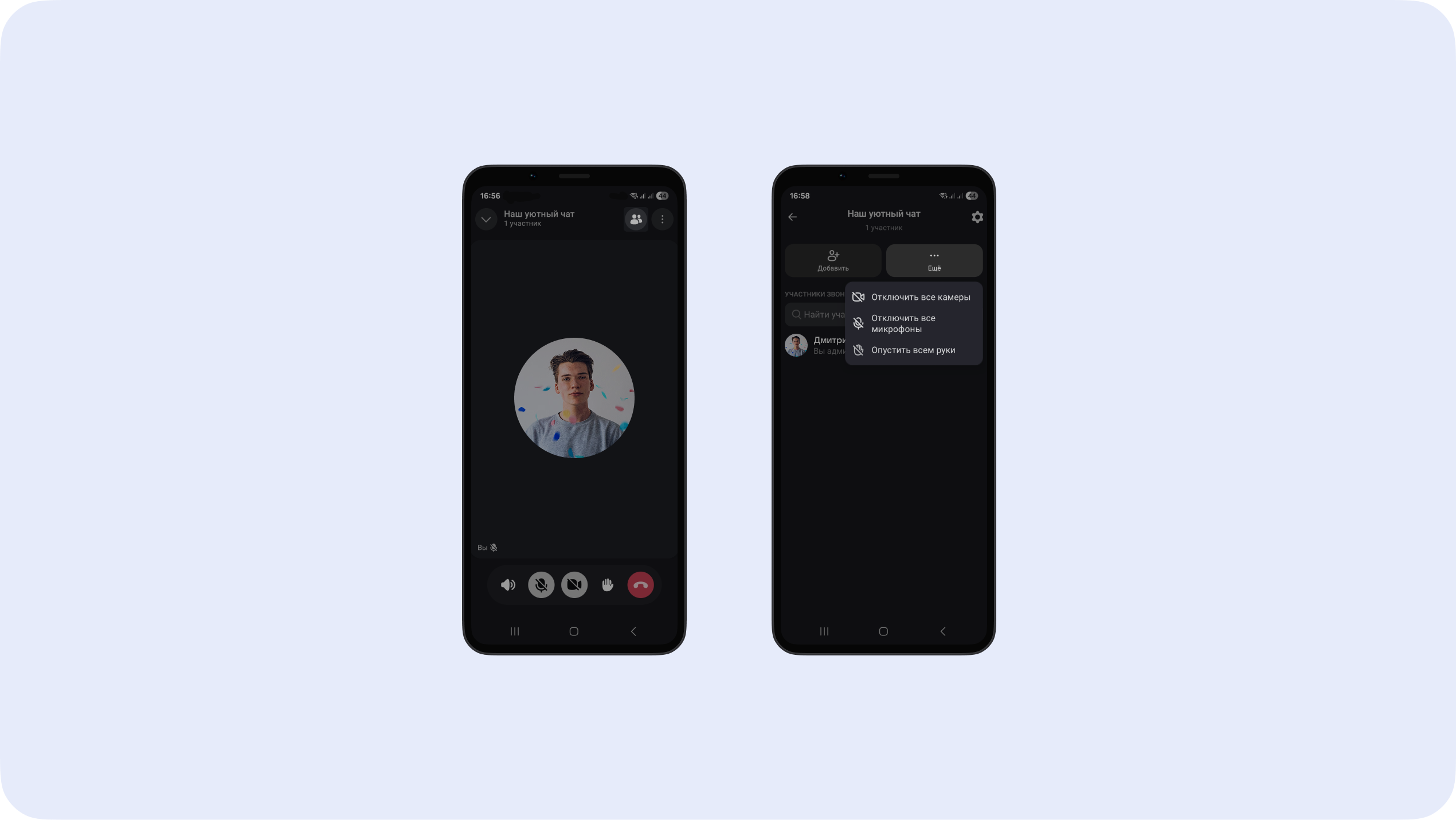 Создатель и администратор звонка с помощью настроек звонка может отключить для всех участников возможность включения: камеры, микрофона, показа экрана или записи звонка. При выборе пунктов настроек они распространяются на всех, кроме администраторов звонка.